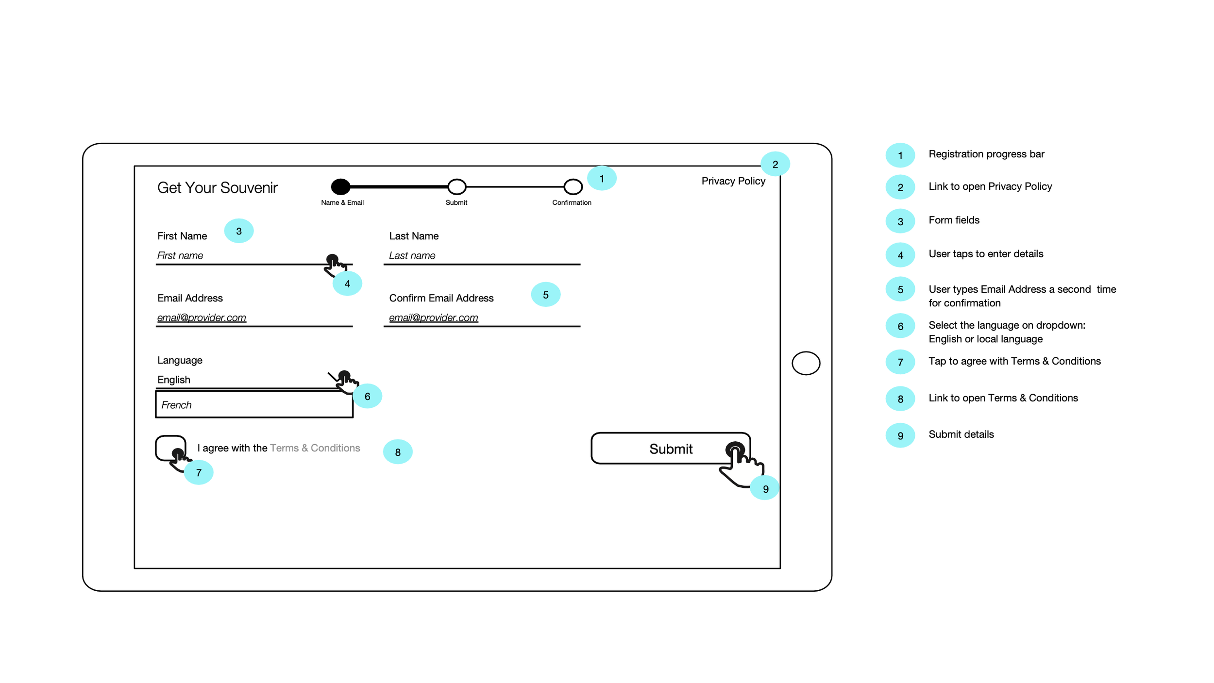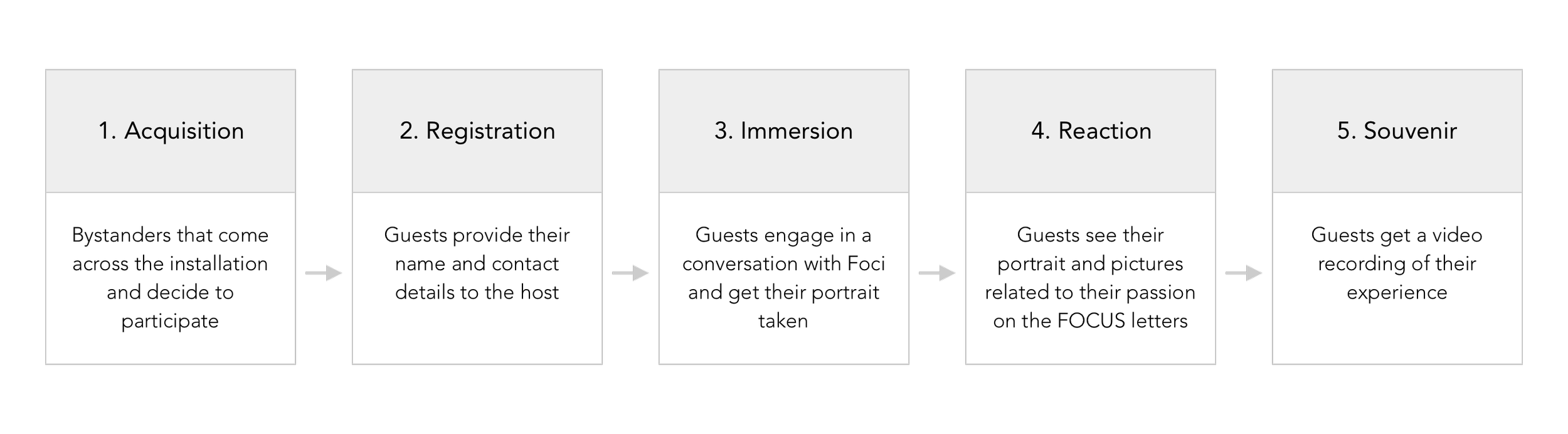 To produce a user-centric experience, I started by planning out the guests’ journey from the acquisition state until they see the outcome on the letters and get their souvenir of the experience. The user journey included the following steps: